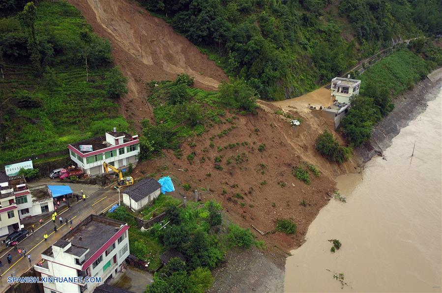 GANSU, julio 12, 2018 (Xinhua) -- Rescatistas limpian una carretera nacional cortada por un desprendimiento de tierra, en la localidad de Bikou del condado de Wenxian, provincia de Gansu, en el noroeste de China, el 12 de julio de 2018. Los niveles del agua del río Yangtze y el río Amarillo han aumentado a medida que las lluvias intensas continúan, lo que provocó inundaciones en algunas partes del condado de Wenxian. (Xinhua/Fan Peishen)