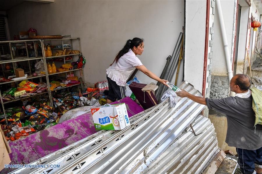 SICHUAN, julio 12, 2018 (Xinhua) -- Una residente envía botellas de agua mineral a sus vecinos, en la localidad de Chenjiaba del condado de Beichuan, provincia de Sichuan, en el suroeste de China, el 12 de julio de 2018. Los torrenciales duraderos de los últimos días han causado severas inundaciones en los condados de Santai, Beichuan y Pingwu en Sichuan. 595 personas que estaban varadas por la inundación en la villa de Laochang de la localidad de Chenjiaba han sido evacuadas. (Xinhua/Zhang Chaoqun)