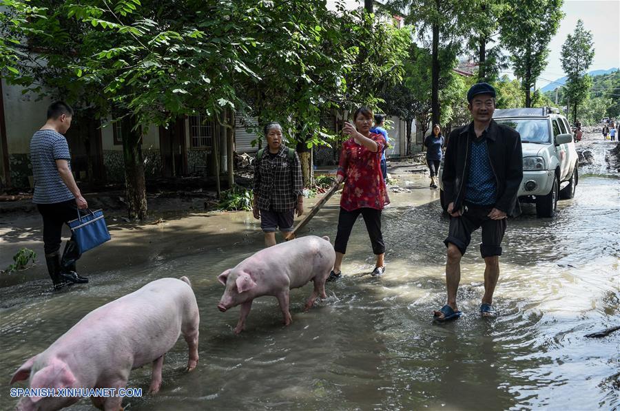 SICHUAN, julio 12, 2018 (Xinhua) -- Residentes recuperan sus cerdos perdidos después de la inundación, en la localidad de Chenjiaba del condado de Beichuan, provincia de Sichuan, en el suroeste de China, el 12 de julio de 2018. Los torrenciales duraderos de los últimos días han causado severas inundaciones en los condados de Santai, Beichuan y Pingwu en Sichuan. 595 personas que estaban varadas por la inundación en la villa de Laochang de la localidad de Chenjiaba han sido evacuadas. (Xinhua/Chen Di)