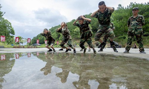 Xinyu,Jiangxi,13/07/2018(El Pueblo en Línea)-Los ni?os participan en un campamento de entrenamiento físico al aire libre durante las vacaciones de verano en Xinyu, provincia de Jiangxi, este de China, el 12 de julio de 2018. (Xinhua / ZhaoChunliang)