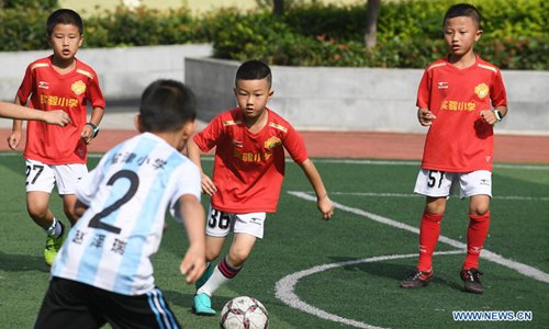 Los estudiantes de una escuela primaria local compiten en un partido amistoso de fútbol durante las vacaciones de verano en Renhuai, provincia de Guizhou, suroeste de China, el 12 de julio de 2018. (Xinhua / ChenYong)