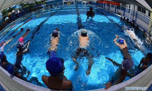Los estudiantes de una escuela primaria local asisten a una clase de natación durante las vacaciones de verano en Qionghai, provincia de Hainan, sur de China, el 12 de julio de 2018. (Xinhua / MengZhongde)