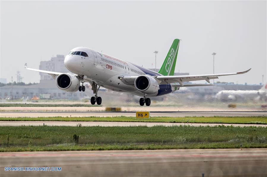 El C919, el primer avión comercial desarrollado por China, realizó un exitoso vuelo inaugural el 5 de mayo de 2017 en el Aeropuerto Internacional Pudong en Shanghai.
