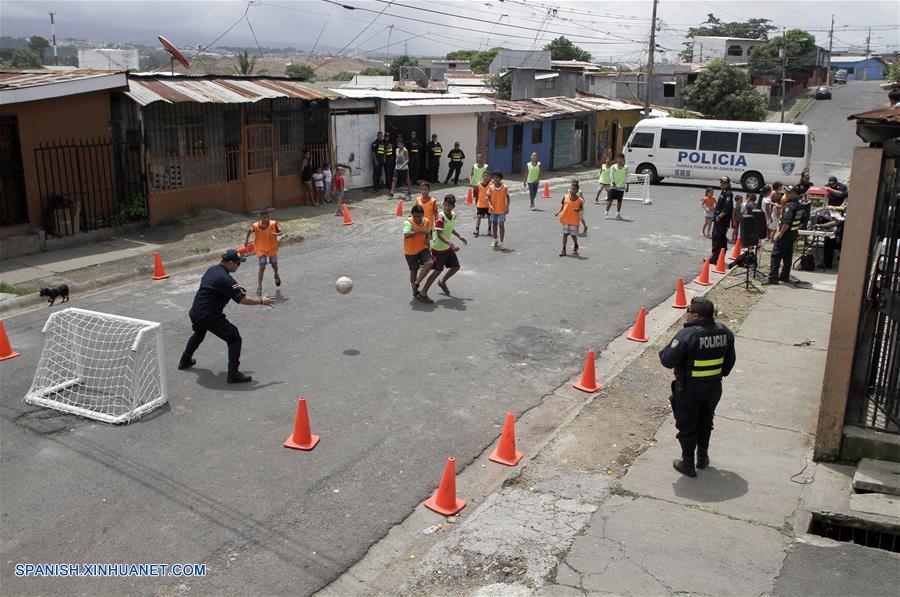SAN JOSE, julio 13, 2018 (Xinhua) -- Ni?os juegan fútbol con oficiales de la policía durante las vacaciones de verano, en San José, Costa Rica, el 13 de julio de 2018. De acuerdo con información de la prensa local, "La Mejenga", una iniciativa que propone organizar partidos de fútbol en comunidades necesitadas, fue creada por el Ministerio de Seguridad Pública de Costa Rica en convenio con la Federación Costarricense de Fútbol con el objetivo de recuperar las zonas tomadas por bandas criminales y generar espacios más seguros y saludables para los ciudadanos, así como para crear una oportunidad para advertir a los ni?os y jóvenes sobre los peligros de las drogas, la violencia y el crimen. (Xinhua/Kent Gilbert)