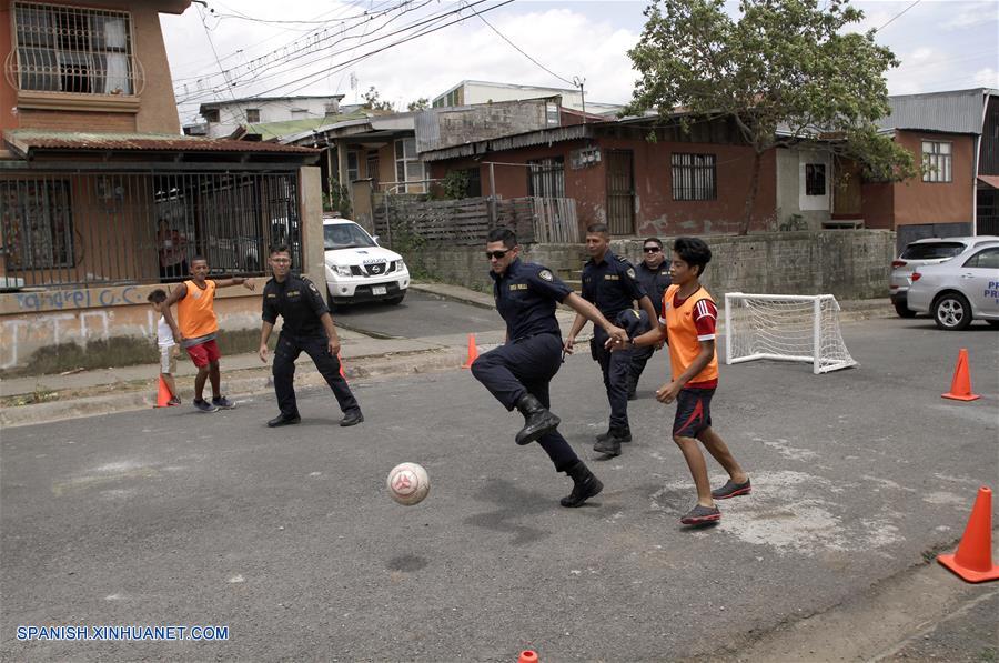 SAN JOSE, julio 13, 2018 (Xinhua) -- Ni?os juegan fútbol con oficiales de la policía durante las vacaciones de verano, en San José, Costa Rica, el 13 de julio de 2018. De acuerdo con información de la prensa local, "La Mejenga", una iniciativa que propone organizar partidos de fútbol en comunidades necesitadas, fue creada por el Ministerio de Seguridad Pública de Costa Rica en convenio con la Federación Costarricense de Fútbol con el objetivo de recuperar las zonas tomadas por bandas criminales y generar espacios más seguros y saludables para los ciudadanos, así como para crear una oportunidad para advertir a los ni?os y jóvenes sobre los peligros de las drogas, la violencia y el crimen. (Xinhua/Kent Gilbert)