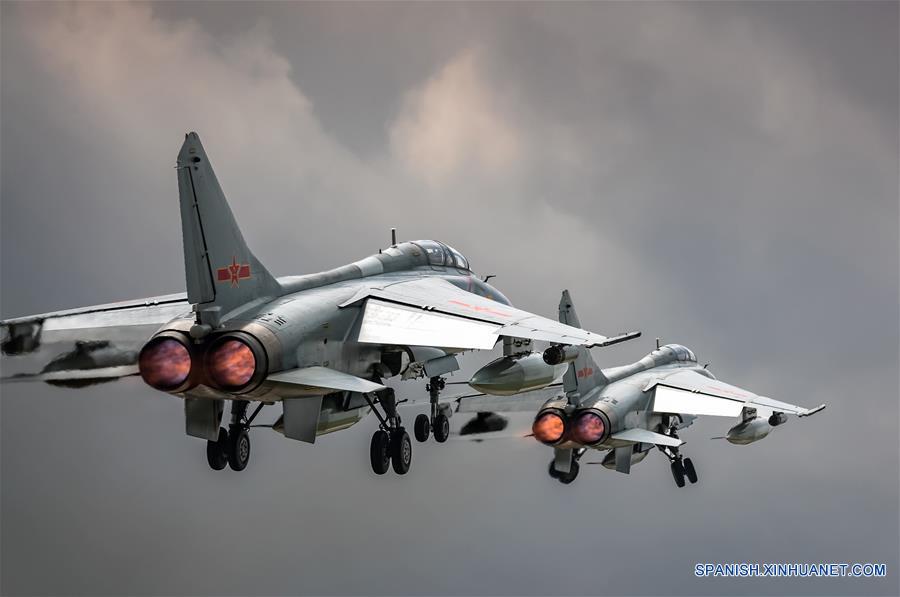 JINAN, julio 12, 2018 (Xinhua) -- Dos cazabombarderos JH-7A de la fuerza aérea del Ejército Popular de Liberación (EPL) de China vuelan durante un módulo de entrenamiento en preparación para los Juegos Militares Internacionales, el 12 de julio de 2018. La fuerza aérea del Ejército Popular de Liberación (EPL) de China enviará bombarderos H-6K, cazas J-10A, cazabombarderos JH-7A, aviones de transporte IL-76 y Y-9 y un equipo de tropas aerotransportadas a Rusia para participar en los Juegos Militares Internacionales. Esta será la primera vez que bombarderos H-6K y aviones de transporte Y-9 viajan al extranjero para participar en competencias militares, se?aló durante una conferencia de prensa un vocero de la fuerza aérea del EPL. (Xinhua/Yang Pan)