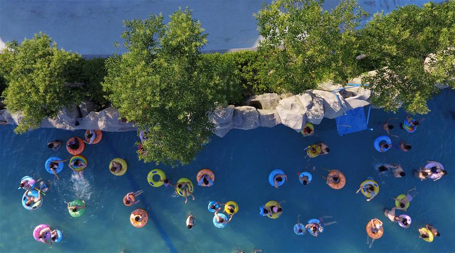 JIANGSU, julio 15, 2018 (Xinhua) -- Vista aérea de personas divirtiéndose en un parque acuático en Yangzhou, provincia de Jiangsu, en el este de China, el 15 de julio de 2018. Personas alrededor de China se unieron a varias actividades acuáticas para buscar un descanso refrescante de las olas de calor veraniego. (Xinhua/Meng Delong)
