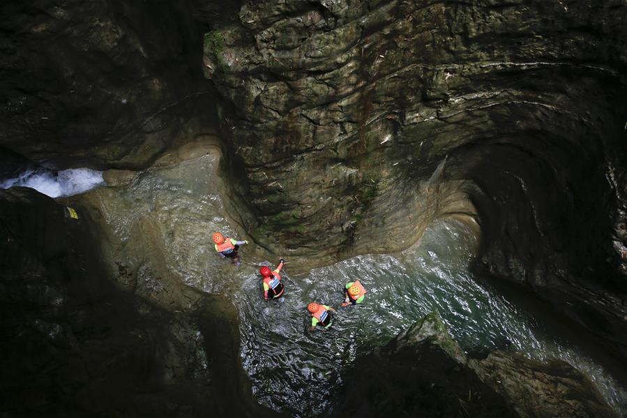 CHONGQING, julio 15, 2018 (Xinhua) -- Personas participan en una competencia de barranquismo en el punto escénico de Jindaoxia, en Chongqing, en el suroeste de China, el 15 de julio de 2018. Personas alrededor de China se unieron a varias actividades acuáticas para buscar un descanso refrescante de las olas de calor veraniego. (Xinhua/Qin Tingfu)