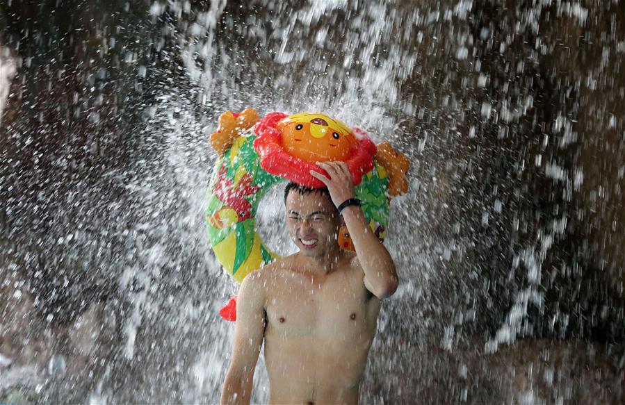 HUBEI, julio 15, 2018 (Xinhua) -- Imagen del 14 de julio de 2018 de turistas avanzando a través de una cascada en un punto escénico del distrito Yiling de Yichang, provincia central de Hubei, China. Personas alrededor de China se unieron a varias actividades acuáticas para buscar un descanso refrescante de las olas de calor veraniego. (Xinhua/Zhang Guorong)