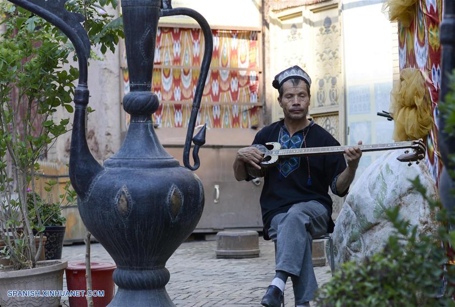 XINJIANG, julio 15, 2018 (Xinhua) -- Imagen del 11 de julio de 2018 de un hombre tocando un instrumento musical en el viejo pueblo de Kashgar, en la Región Autónoma Uygur de Xinjiang, en el noroeste de China. (Xinhua/Zhao Ge)