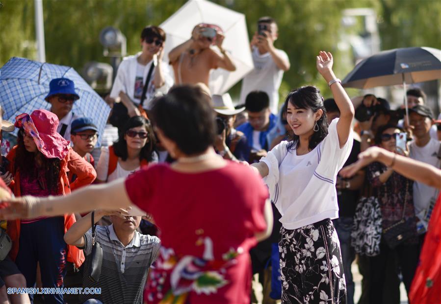 XINJIANG, julio 15, 2018 (Xinhua) -- Imagen del 11 de julio de 2018 de turistas y residentes locales bailando en el viejo pueblo de Kashgar, en la Región Autónoma Uygur de Xinjiang, en el noroeste de China. (Xinhua/Zhao Ge)