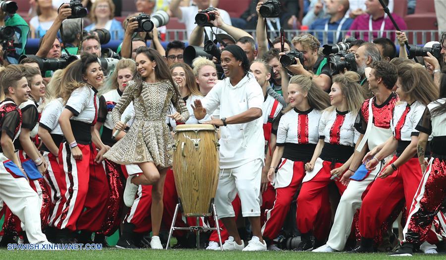MOSCU, julio 15, 2018 (Xinhua) -- El ex jugador brasile?o de fútbol, Ronaldinho (c-frente), participa en la ceremonia de clausura de la Copa Mundial de la FIFA Rusia 2018, en Moscú, Rusia, el 15 de julio de 2018. (Xinhua/Fei Maohua)
