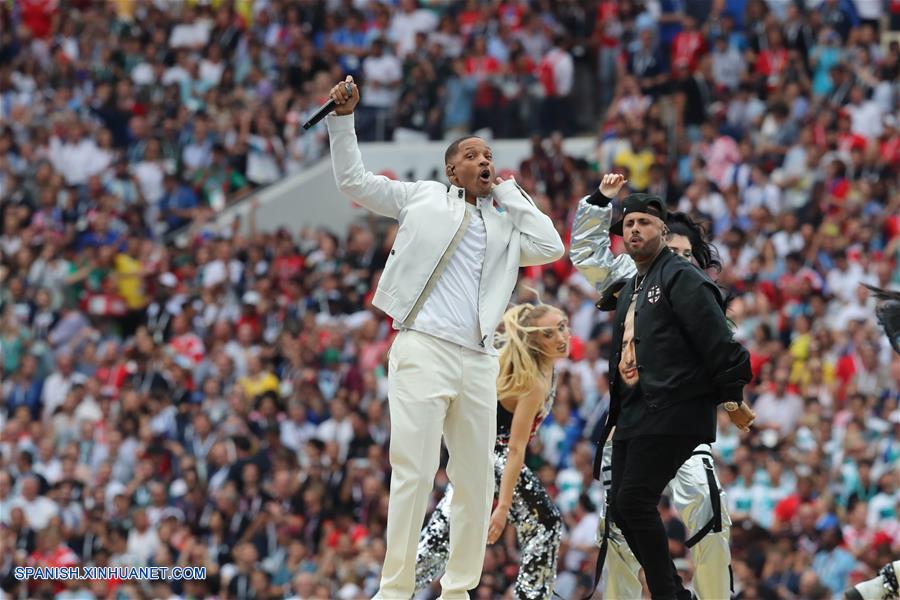 MOSCU, julio 15, 2018 (Xinhua) -- El actor estadounidense, Will Smith (i-frente), realiza un espectáculo durante la ceremonia de clausura de la Copa Mundial de la FIFA Rusia 2018, en Moscú, Rusia, el 15 de julio de 2018. (Xinhua/Li Ming)