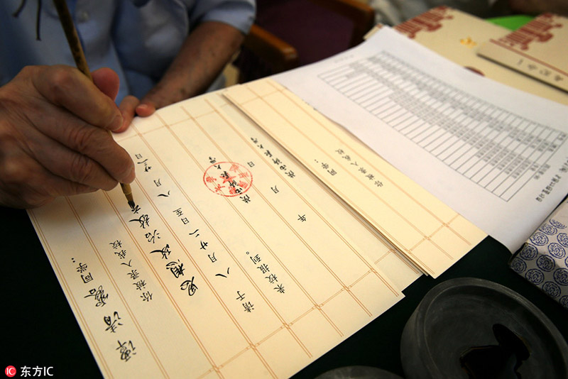 Los profesores escriben a mano cartas de admisión en la Universidad Normal de Shaanxi en Xi'an, provincia de Shaanxi, el 16 de julio de 2018. [Foto / IC]