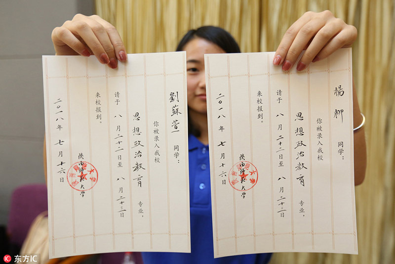 Xi'an, Shaanxi, 17/07/2018 (El Pueblo en Línea) - Una estudiante muestra dos cartas manuscritas de admisión emitidas por la Universidad Normal de Shaanxi en Xi'an, provincia de Shaanxi, el 16 de julio de 2018. Para promover la escritura tradicional china, la universidad ha estado enviando cartas de admisión escritas por profesores a mano durante los últimos 12 a?os. [Foto / IC]
