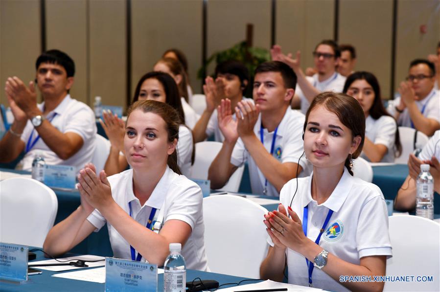 SHANDONG, julio 16, 2018 (Xinhua) -- Participantes asisten a la ceremonia de inauguración del 3 Campus Juvenil de la Organización de Cooperación de Shanghai (OCS), en Qingdao, provincia de Shandong, en el este de China, el 16 de julio de 2018. El Campus Juvenil de la OCS 2018 inició el lunes en Qingdao. Más de 200 asistentes de estados miembros y observadores de la OCS participan en el evento, que se llevará a cabo hasta el domingo en Qingdao y Beijing. (Xinhua/Li Ziheng)