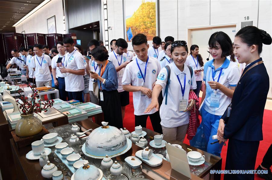 SHANDONG, julio 16, 2018 (Xinhua) -- Asistentes visitan un centro internacional de conferencias, en Qingdao, provincia de Shandong, en el este de China, el 16 de julio de 2018. El Campus Juvenil de la Organización de Cooperación de Shanghai (OCS) 2018 inició el lunes en Qingdao. Más de 200 asistentes de estados miembros y observadores de la OCS participan en el evento, que se llevará a cabo hasta el domingo en Qingdao y Beijing. (Xinhua/Li Ziheng)