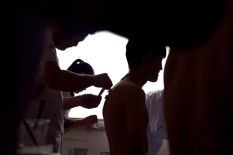 GUIZHOU, julio 17, 2018 (Xinhua) -- Doctores practican tratamiento de "Sanfutie", o parches medicinales Sanfu, a un ciudadano, en el condado de Yuqing, provincia de Guizhou, en el suroeste de China, el 17 de julio de 2018. El martes marca el comienzo del sanfu, que se refiere a los tres periodos de 10 días que son predichos para ser los días más calurosos del a?o. El Sanfutie es un tratamiento de Medicina Tradicional China (TCM, por sus siglas en inglés) contra temporal típico, que trata las enfermedades relacionadas con el clima frío en el verano caluroso con parches hechos con medicina herbal china tradicional colocados en varios puntos de acupuntura en el cuerpo. (Xinhua/He Chunyu)