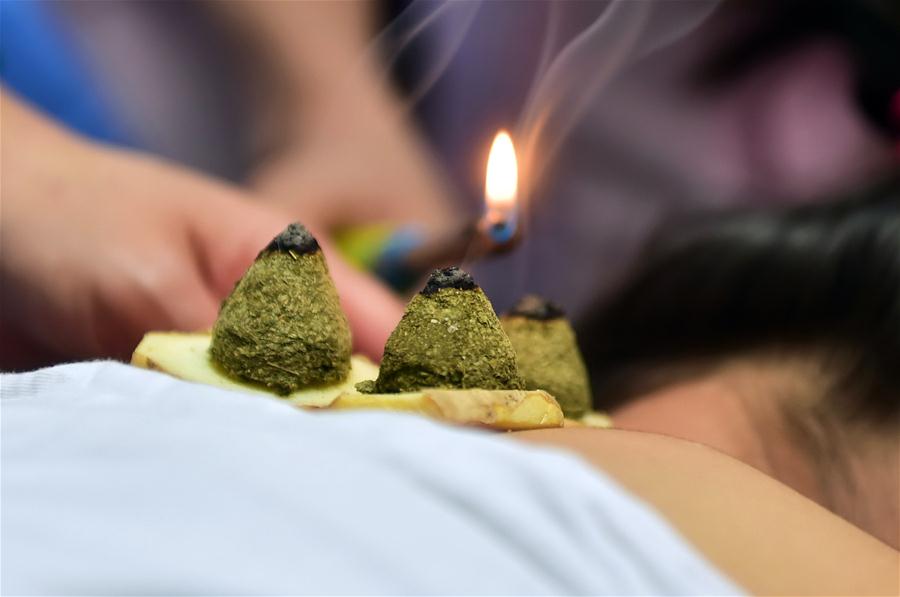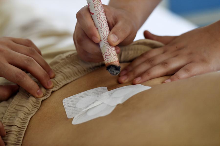 FUJIAN, julio 17, 2018 (Xinhua) -- Una paciente recibe tratamiento de moxibustión en un centro de medicina china, en la ciudad de Fuzhou, provincia de Fujian, en el sureste de China, el 17 de julio de 2018. Cuando la parte más caliente del verano comienza en China, muchas personas acuden a los hospitales de medicina tradicional china para prevenir enfermedades mediante la aplicación de varillas de hierbas en puntos de acupuntura. (Xinhua/Lin Shanchuan)