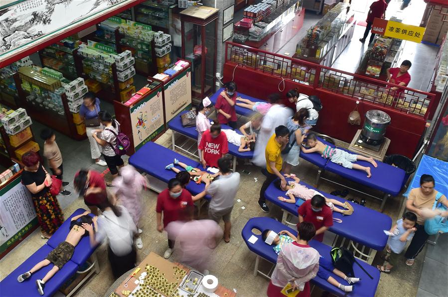 FUJIAN, julio 17, 2018 (Xinhua) -- Ciudadanos reciben tratamiento de moxibustión en un centro de medicina china, en la ciudad de Fuzhou, provincia de Fujian, en el sureste de China, el 17 de julio de 2018. Cuando la parte más caliente del verano comienza en China, muchas personas acuden a los hospitales de medicina tradicional china para prevenir enfermedades mediante la aplicación de varillas de hierbas en puntos de acupuntura. (Xinhua/Lin Shanchuan)