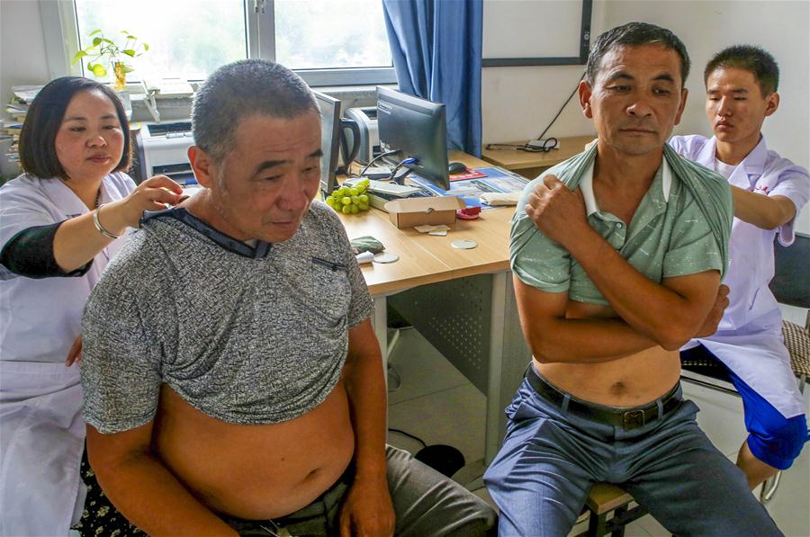 HEBEI, julio 17, 2018 (Xinhua) -- Doctores practican terapia de hierbas a los ciudadanos en el Hospital del Pueblo del condado de Raoyang, provincia de Hebei, en el norte de China, el 17 de julio de 2018. Cuando la parte más caliente del verano comienza en China, muchas personas acuden a los hospitales de medicina tradicional china para prevenir enfermedades mediante la aplicación de varillas de hierbas en puntos de acupuntura. (Xinhua/Li Xiaoguo)