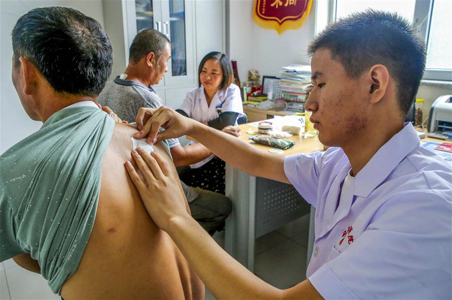 SHANDONG, julio 17, 2018 (Xinhua) -- Doctores practican tratamiento de "Sanfutie", o parches medicinales Sanfu, a los ciudadanos, en el condado de Yiyuan, provincia de Shandong, en el este de China, el 17 de julio de 2018. El martes marca el comienzo del sanfu, que se refiere a los tres periodos de 10 días que son predichos para ser los días más calurosos del a?o. El Sanfutie es un tratamiento de Medicina Tradicional China (TCM, por sus siglas en inglés) contra temporal típico, que trata las enfermedades relacionadas con el clima frío en el verano caluroso con parches hechos con medicina herbal china tradicional colocados en varios puntos de acupuntura en el cuerpo. (Xinhua/Zhao Xiaoming)