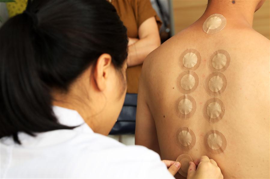 CHONGQING, julio 17, 2018 (Xinhua) -- Una doctora practica tratamiento de "Sanfutie", o parches medicinales Sanfu, a un ciudadano, en Chongqing, en el suroeste de China, el 17 de julio de 2018. El martes marca el comienzo del sanfu, que se refiere a los tres periodos de 10 días que son predichos para ser los días más calurosos del a?o. El Sanfutie es un tratamiento de Medicina Tradicional China (TCM, por sus siglas en inglés) contra temporal típico, que trata las enfermedades relacionadas con el clima frío en el verano caluroso con parches hechos con medicina herbal china tradicional colocados en varios puntos de acupuntura en el cuerpo. (Xinhua/Yang Min)