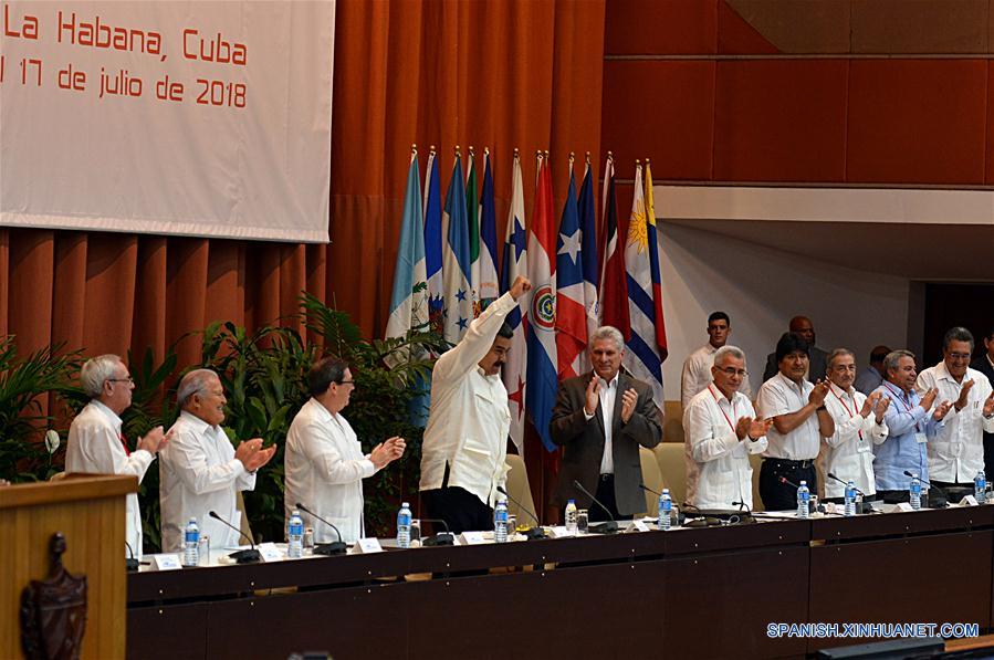 El presidente de Cuba, Miguel Díaz-Canel (5-i), el presidente de Venezuela, Nicolás Maduro (4-i), el presidente de Bolivia, Evo Morales (4-d), y el presidente de El Salvador, Salvador Sánchez Cerén (2-i) participan durante la última jornada del XXIV Encuentro del Foro de Sao Paulo, llevado a cabo en el Palacio de Convenciones de La Habana, en La Habana, Cuba, el 17 de julio de 2018. (Xinhua/Str)
