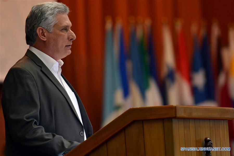 El presidente de Cuba, Miguel Díaz-Canel, pronuncia un discurso durante la última jornada del XXIV Encuentro del Foro de Sao Paulo, llevado a cabo en el Palacio de Convenciones de La Habana, en La Habana, Cuba, el 17 de julio de 2018. (Xinhua/Joaquín Hernández)