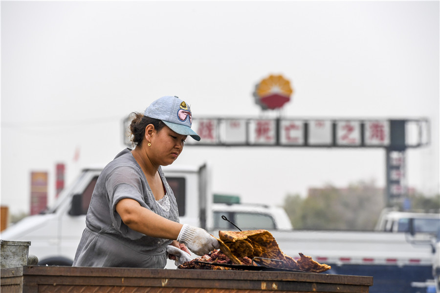 El camionero Memet Barat, de 54 a?os, ha estado atravesando esta carretera durante cinco a?os. Hoy, él viaja desde el condado Luntai en el extremo norte de la carretera a la prefectura de Hotan en el extremo sur del vasto desierto. Para él, las luces de Tazhong son como un faro en medio del mar de arena, un oasis de bienvenida después de un largo y caluroso día conduciendo.