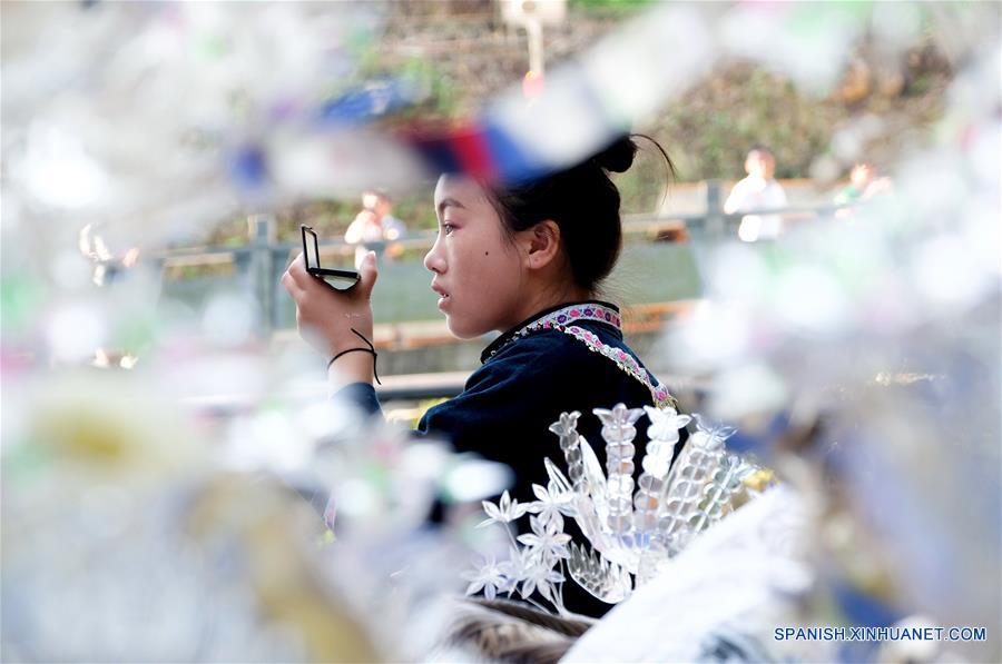 GUIZHOU, julio 18, 2018 (Xinhua) -- Una joven se maquilla para la celebración del "Liuyueliu", en la villa de Yaobai del condado de Jinping, provincia de Guizhou, en el suroeste de China, el 18 de julio de 2018. El miércoles marca el "Liuyueliu", el sexto día del sexto mes del calendario lunar chino. Los residentes del lugar celebran el "Liuyueliu" con largas mesas de banquete. (Xinhua/Peng Zeliang)