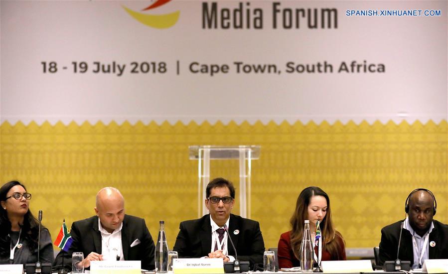 Representantes asisten al tercer Foro de Medios de BRICS en Ciudad del Cabo, Sudáfrica, el 18 de julio de 2018. Los líderes de medios de comunicación de los países BRICS se reunieron el miércoles en Ciudad del Cabo para discutir la cooperación en el Foro de Medios de BRICS inaugurado en Ciudad del Cabo, Sudáfrica. El Tercer Foro de Medios de BRICS tiene como tema "Cooperación entre Medios de BRICS: Impulsando un Orden Mundial Inclusivo y Justo". (Xinhua/Wang Teng)