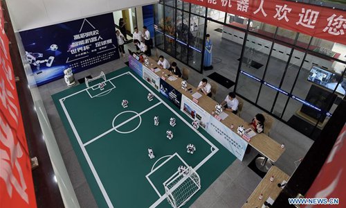 Los estudiantes observan un partido de fútbol entre robots organizado por las escuelas profesionales superiores en Beijing, el 18 de julio de 2018. Alrededor de 200 estudiantes de 30 escuelas profesionales superiores participaron en el partido. (Xinhua / Li Xin)