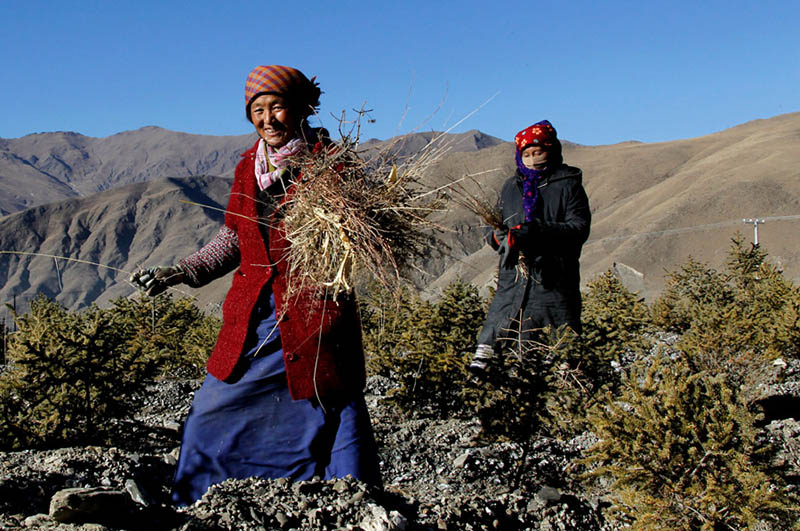 Tsering Tsamgyi, de 53 a?os, trabaja en una base de viveros, parte de un proyecto de alivio de la pobreza en la aldea de Xuecun, ciudad de Nedong, Lhokha, región autónoma del Tíbet. Chen Zebing / China Daily