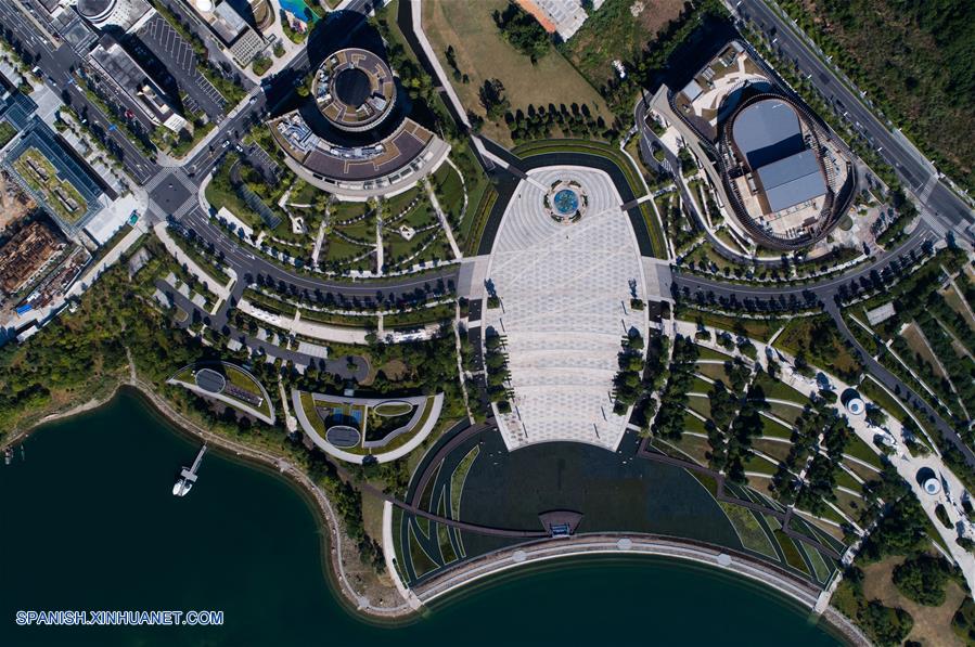 Vista aérea de la plaza Perla, en el condado de Chun'an, provincia de Zhejiang, en el este de China, el 18 de julio de 2018. La zona de desarrollo económico de Chun'an se localiza en la orilla del lago Qiandao, un parque forestal nacional y destino turístico de nivel 5A de China. En los últimos 25 a?os, el gobierno local ha impulsado el turismo ecológico y la protección del medio ambiente en la zona, que se centran en la gestión fluvial, la protección de las fuentes de agua potable y el dise?o del paisaje. (Xinhua/Xu Yu)