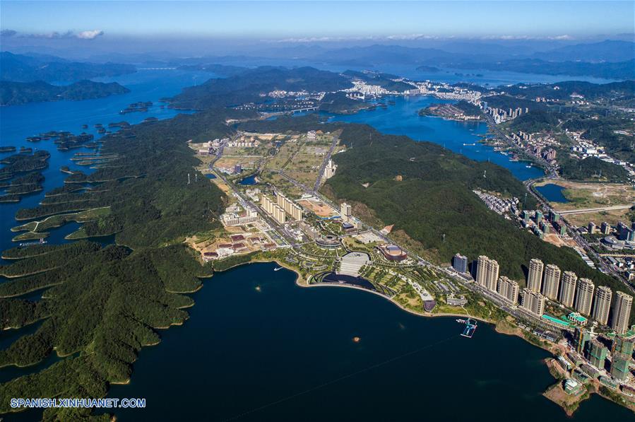 ZHEJIANG, julio 18, 2018 (Xinhua) -- Vista aérea de un paisaje captado junto al lago Qiandao, en el condado de Chun'an, provincia de Zhejiang, en el este de China, el 18 de julio de 2018. La zona de desarrollo económico de Chun'an se localiza en la orilla del lago Qiandao, un parque forestal nacional y destino turístico de nivel 5A de China. En los últimos 25 a?os, el gobierno local ha impulsado el turismo ecológico y la protección del medio ambiente en la zona, que se centran en la gestión fluvial, la protección de las fuentes de agua potable y el dise?o del paisaje. (Xinhua/Xu Yu)