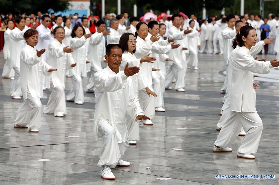 Aficionados de Taiji (boxeo chino con un adversario imaginario) realizan una actuacón en la antigua localidad de Kongtong en la ciudad de Pingliang, provincia de Gansu, en el noroeste de China, el 21 de julio de 2018. Más de 100,000 aficionados del Taiji participaron en el espectáculo durante la ceremonia de inauguración de un festival de turismo llevado a cabo el sábado en la ciudad de Pingliang. (Xinhua/Yang Xin)