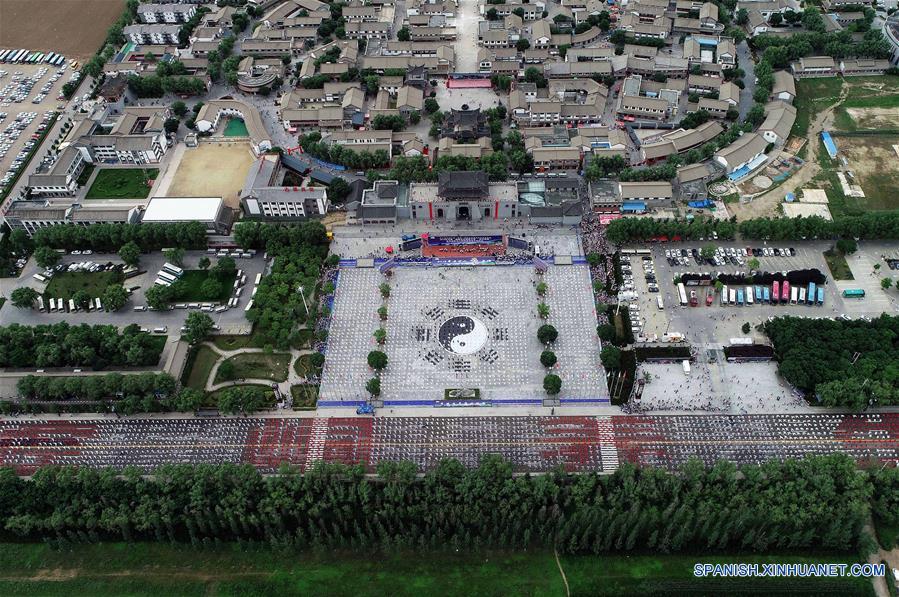 Vista aérea del espectáculo de Taiji (boxeo chino con un adversario imaginario), en la antigua localidad de Kongtong en la ciudad de Pingliang, provincia de Gansu, en el noroeste de China, el 21 de julio de 2018. Más de 100,000 aficionados del Taiji participaron en el espectáculo durante la ceremonia de inauguración de un festival de turismo llevado a cabo el sábado en la ciudad de Pingliang. (Xinhua/Yang Xin)