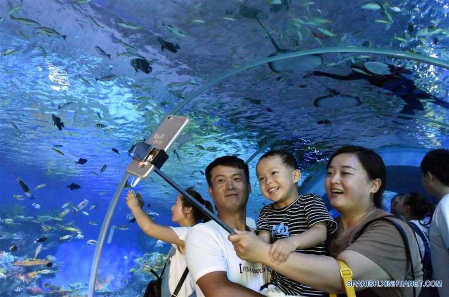 Visitantes posan en el Parque Oceánico de Rizhao, en Rizhao, provincia de Shandong, en el este de China, el 21 de julio de 2018. Un carnaval oceánico de dos meses de duración comenzó el sábado en el Parque Oceánico de Rizhao. (Xinhua/Du Yubao)