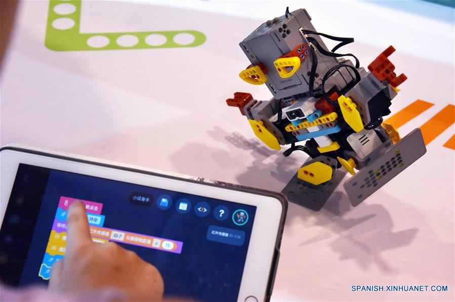 Un visitante opera un robot durante la Exposición Internacional de Electrónica de Consumo de China 2018, en Qingdao, provincia de Shandong, en el este de China, el 21 de julio de 2018. La exposición de electrónica de cuatro días de duración comenzó el viernes. (Xinhua/Li Ziheng)