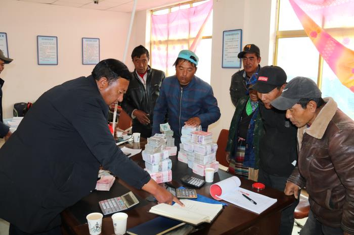 Dak Padruk paga salario a sus empleados en un sitio de construcción en el condado de Lhunze en el Tíbet en 2017. Fotos proporcionadas a China Daily