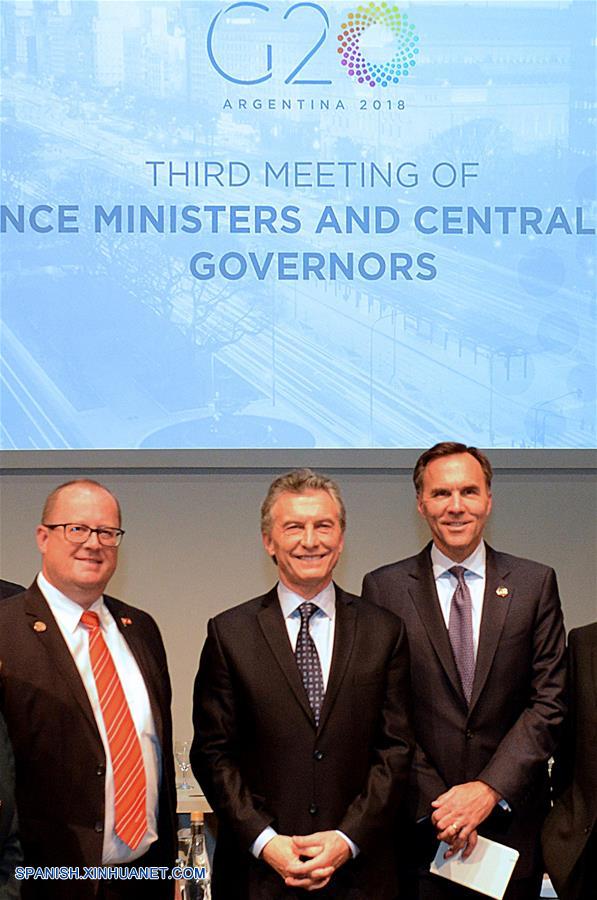 El presidente de Argentina, Mauricio Macri (c), posa con los asistentes a la 3 Reunión de ministros de Finanzas y presidentes de Bancos Centrales del G20, en el Centro de Exposiciones y Convenciones (CEC) de la ciudad de Buenos Aires, capital de Argentina, el 22 de julio de 2018. El presidente de Argentina, Mauricio Macri, dijo el domingo estar "muy satisfecho" por el progreso de los distintos grupos de trabajo del Grupo de los Veinte (G20) en el contexto de la presidencia argentina del foro multilateral. Macri expresó lo anterior en el Centro de Exposiciones y Convenciones (CEC) de Buenos Aires, donde se lleva a cabo la tercera reunión anual de ministros de Finanzas del G20. (Xinhua/Str)