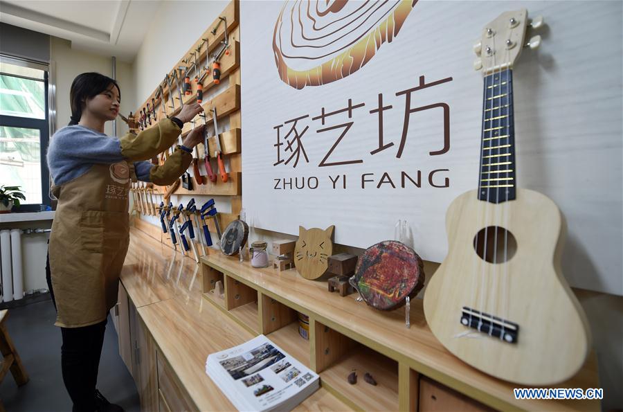 Song Lele, joven de 23 a?os, trabaja en su taller de artesanía de madera en Lanzhou, provincia de Gansu, 10 de enero del 2018. [Foto: Xinhua]