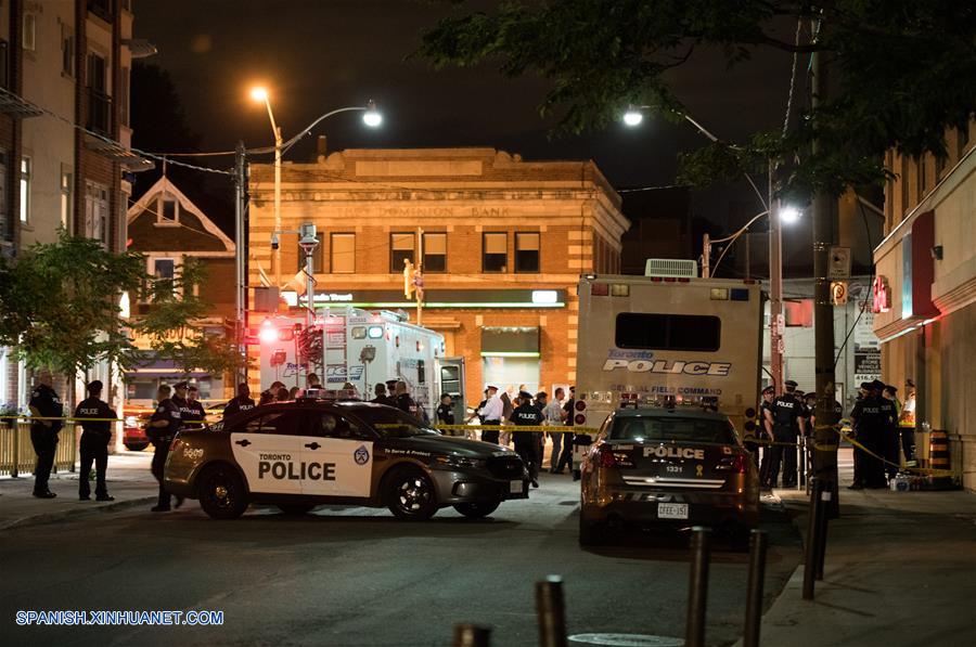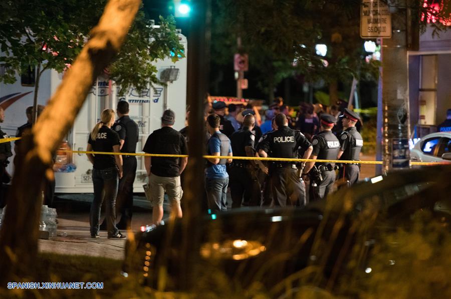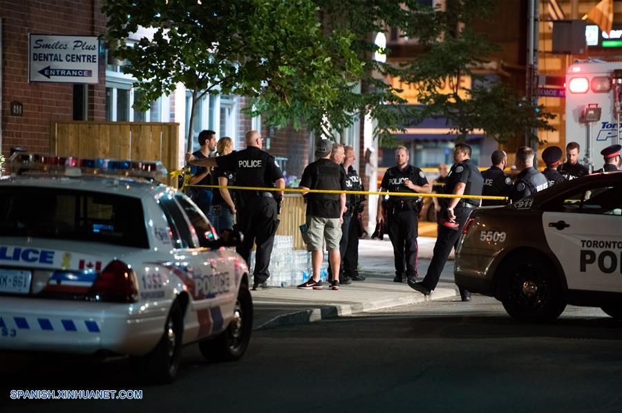 TORONTO, julio 23, 2018 (Xinhua) -- Oficiales de policía se reúnen en la escena del crimen, en Toronto, Canadá, el 23 de julio de 2018. Una persona murió y otras 13 resultaron heridas en un tiroteo perpetrado por un hombre armado en una concurrida zona de la ciudad canadiense de Toronto tras el que el autor fue abatido, según la cadena CTV. (Xinhua/Li Haitao)