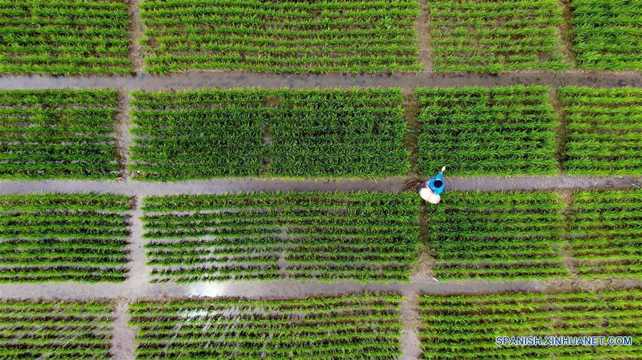 JIANGSU, julio 23, 2018 (Xinhua) -- Vista aérea de un agricultor aplicando fertilizante en un instituto de investigación de agricultura, en el área de Lixiahe, en Yangzhou, provincia de Jiangsu, en el este de China, el 23 de julio de 2018. El Gran Calor, o Dashu en el calendario lunar chino, que significa el día más caluroso del verano, cae el 23 de julio este a?o. (Xinhua/Meng Delong)