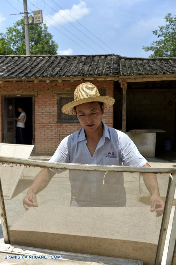 GANSU, julio 23, 2018 (Xinhua) -- Imagen del 22 de julio de 2018 del artesano Liu Xiaobo realizando papel Xihe, en el condado de Xihe, ciudad de Longnan, provincia de Gansu, en el noroeste de China. Las habilidades para realizar papel Xihe, distinguidas a través del tiempo y con una historia de miles de a?os, se han convertido en una nueva fuente de ingresos para los residentes locales. (Xinhua/Li Xiao)