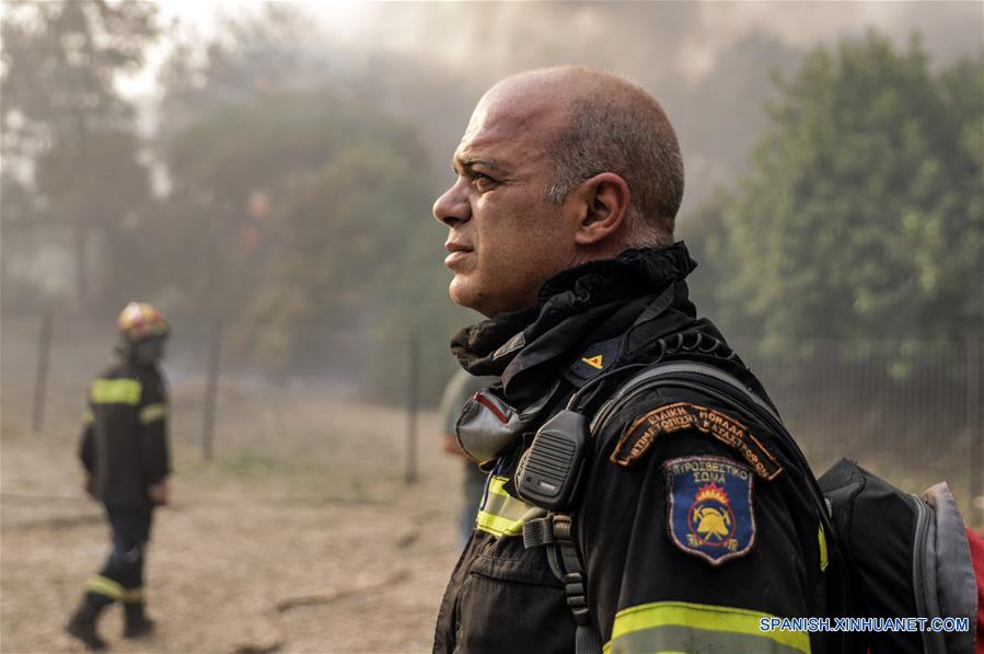 Bomberos laboran en la localidad de Kineta, cerca de Atenas, Grecia, el 23 de julio de 2018. Autoridades locales declararon el lunes un estado de emergencia en Atica debido a tres grandes incendios forestales que asolan suburbios y playas turísticas cerca de la capital griega. Cientos de residentes han tenido que abandonar sus hogares y buscar refugio en el mar, informó la agencia nacional griega AMNA. (Xinhua/Lefteris Partsalis)