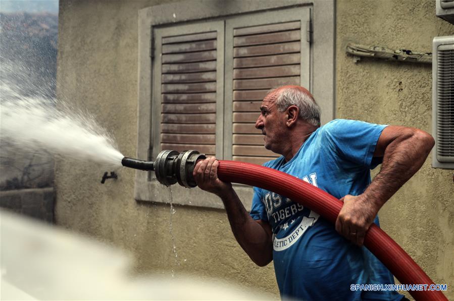 Un hombre intenta apagar las llamas en la localidad de Kineta, cerca de Atenas, Grecia, el 23 de julio de 2018. Autoridades locales declararon el lunes un estado de emergencia en Atica debido a tres grandes incendios forestales que asolan suburbios y playas turísticas cerca de la capital griega. Cientos de residentes han tenido que abandonar sus hogares y buscar refugio en el mar, informó la agencia nacional griega AMNA. (Xinhua/Lefteris Partsalis)