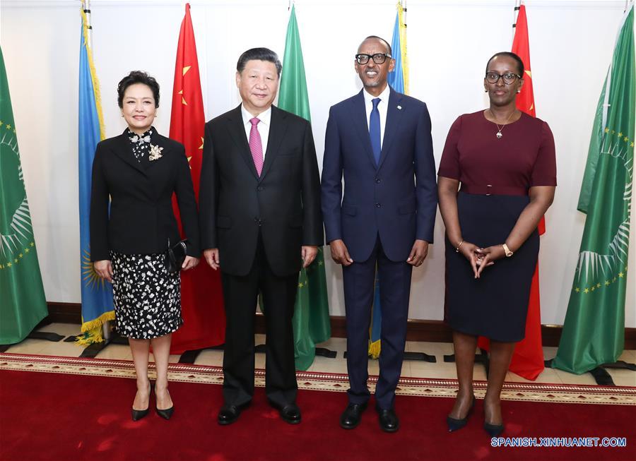 El presidente de China, Xi Jinping (2-i), y su esposa, Peng Liyuan (i), posan con el presidente de Ruanda, Paul Kagame (2-d), y su esposa, Jeannette Kagame, previo a que Xi Jinping sostenga conversaciones con Kagame en Kigali, Ruanda, el 23 de julio de 2018. (Xinhua/Pang Xinglei)