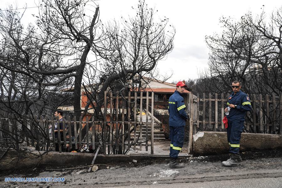 MATI, julio 24, 2018 (Xinhua) -- Bomberos trabajan en una casa quemada en Mati, un pueblo costero en el este de Atenas, Grecia, el 24 de julio de 2018. De acuerdo con información de la prensa local, el número de muertos por los incendios ocurridos cerca de Atenas se ha actualizado a 74 el martes por la tarde, mientras continúa la búsqueda por más víctimas en la costa este de Attica, informó la agencia nacional griega de noticias AMNA. (Xinhua/Lefteris Partsalis)